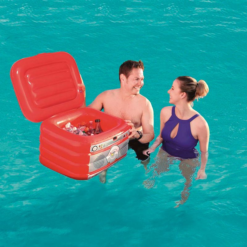 O acompanhamento perfeito para o calor na piscina é uma bebida gelada. O Bar Inflável Rádio foi desenvolvido pensando naqueles que não querem sair da piscina e interromper a diversão. Suportando até 31Kg, possui uma tampa com fecho em velcro que protege as bebidas do sol e é produzido em vinil resistente com 3 câmaras de ar independente. Com capacidade para 36 latas de 473ml, 50 latas de 350ml ou 8 garrafas de 2L sem gelo, é o companheiro ideal para dias quentes, podendo também ser utilizado, também, fora da piscina.