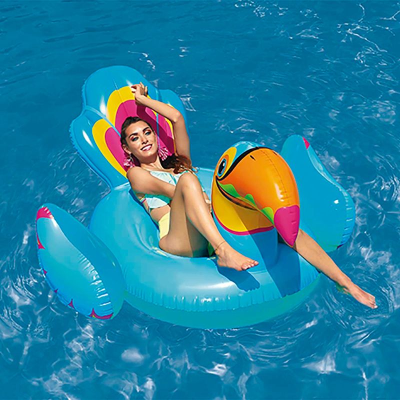 Curtir o sol e a água fresca vai ser ainda mais divertido na companhia da Boia Tucano. Com 1,80m de comprimento e 1,50m de altura ela é garantia de diversão pra toda a família. Produzida em vinil resistente, conta com três câmaras de ar independentes, três válvulas de segurança e acompanha adesivos de reparo. Com capacidade para até 90 Kg, possui duas alças para maior segurança e conta com assento central pra aproveitar com conforto os momentos na piscina ou praia. Peça já a sua e garanta lindas fotos nesse Verão! Atenção! Este não é um equipamento salva-vidas. Nunca deixe crianças sozinhas perto da água sem supervisão de um adulto. Item certificado pelo Inmetro.